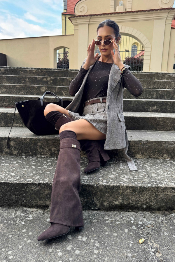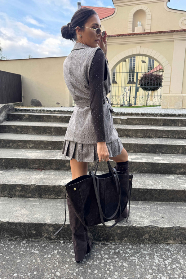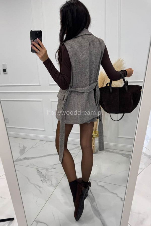 - Czekoladowo-kremowa kamizelka w jodełkę z paskiem SEWEK