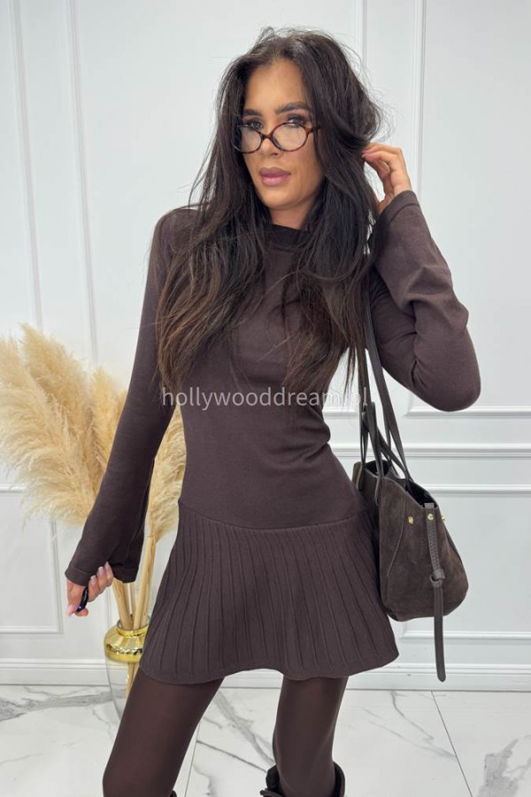 Czekoladowa sukienka z rozszerzonym, plisowanym dołem i rękawami LAURA 09