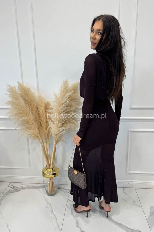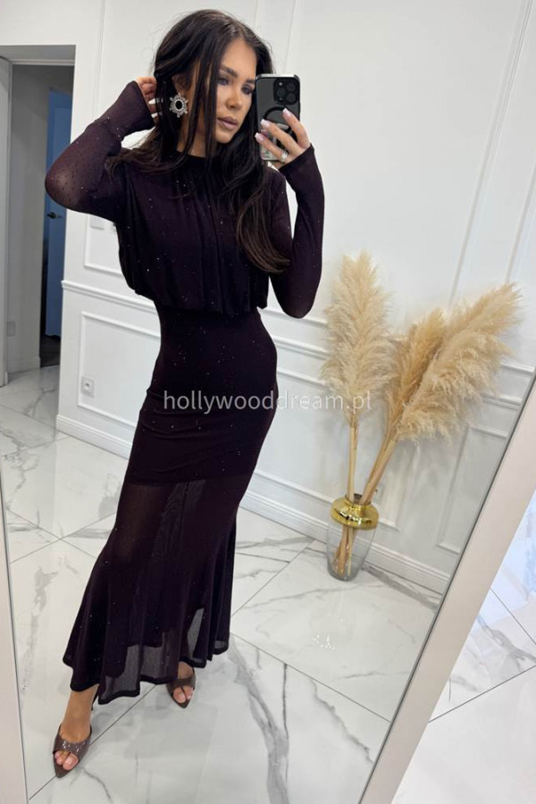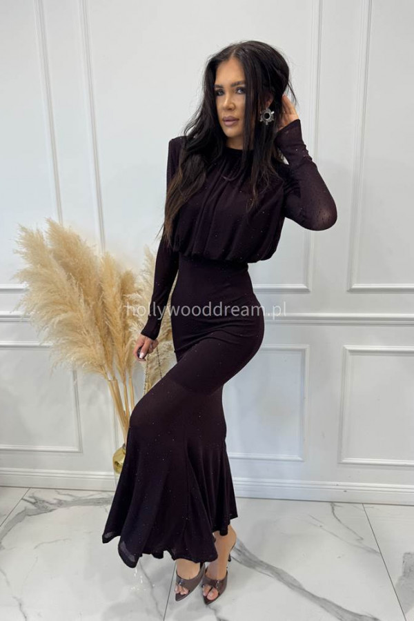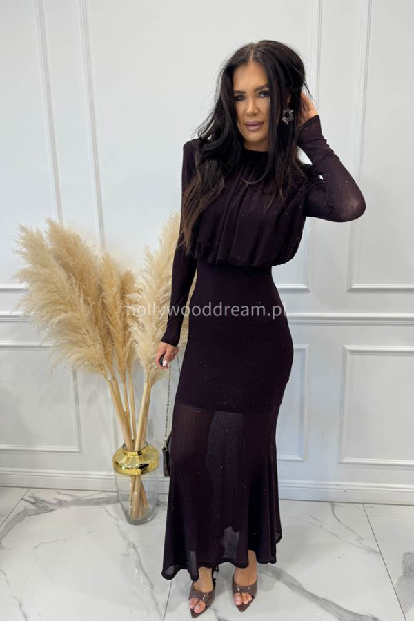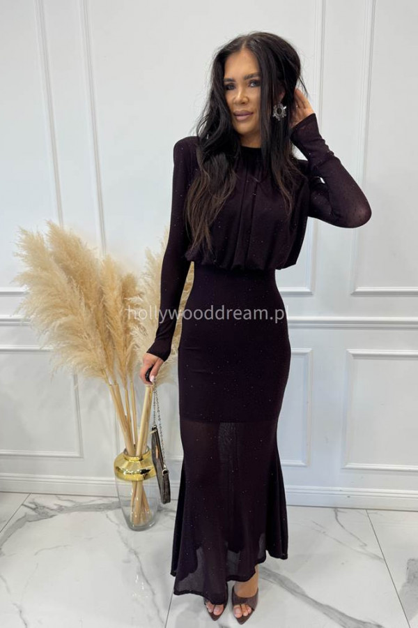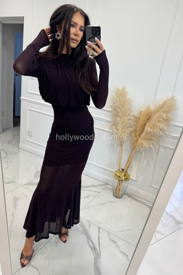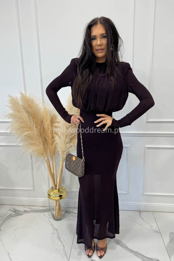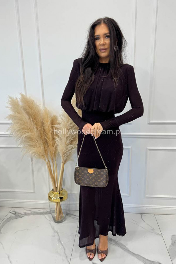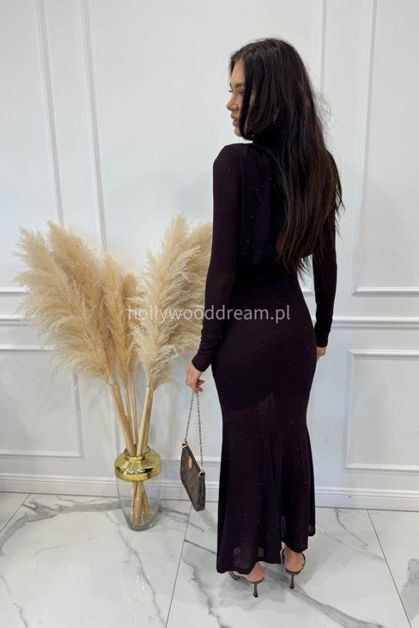 Czekoladowa sukienka maxi z półgolfem i z cekinami DOROTA 24