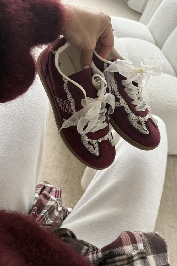 Bordowe buty zamszowe z obszyciem koronki JUDDY wykonane są z wysokiej jakości zamszu w głębokim, bordowym odcieniu, przyciągają spojrzenia subtelnym, koronkowym obszyciem, które dodaje im wyjątkowego uroku i kobiecego charakteru. Miękka wyściółka i solidna podeszwa gwarantują komfort noszenia przez cały dzień, a ponadczasowy design sprawia, że buty świetnie komponują się zarówno z casualowymi, jak i bardziej eleganckimi stylizacjami. Idealne do jeansów, spódnic czy sukienek – JUDDY to klasyka, która nigdy nie wychodzi z mody. Posiadają wymienne sznurówki - możesz używać dziewczęcych i uroczych wstążek lub klasycznych sznurowadeł w kolorze bordowym.