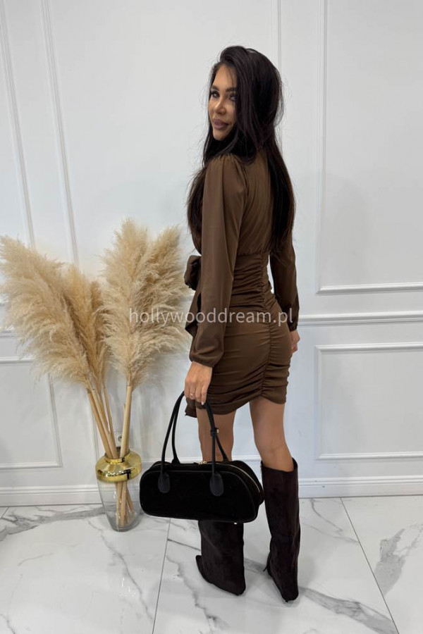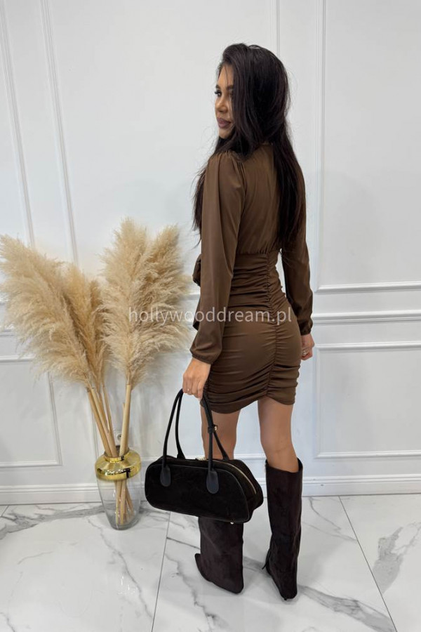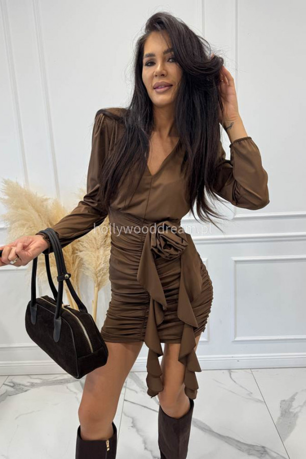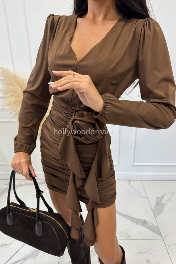 Brązowa sukienka drapowana z różą MAJA 19