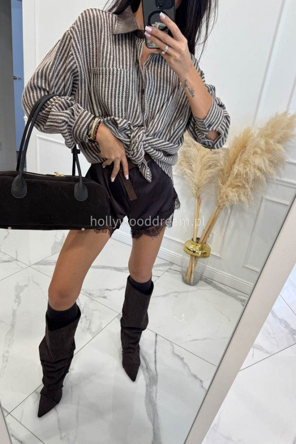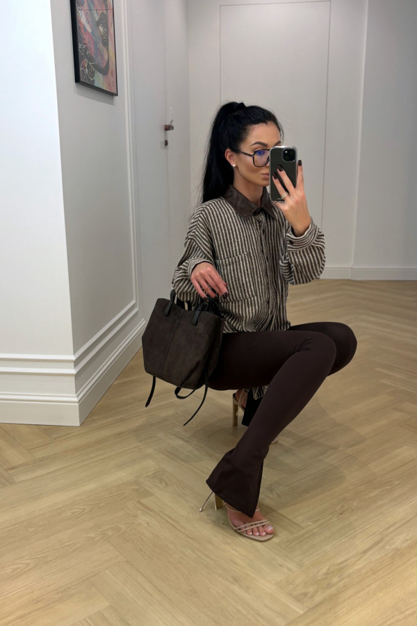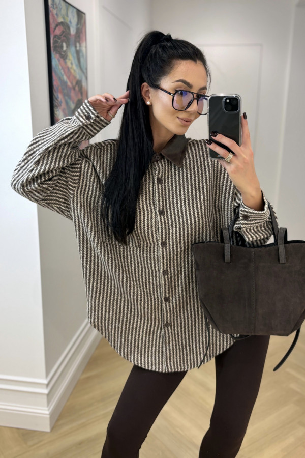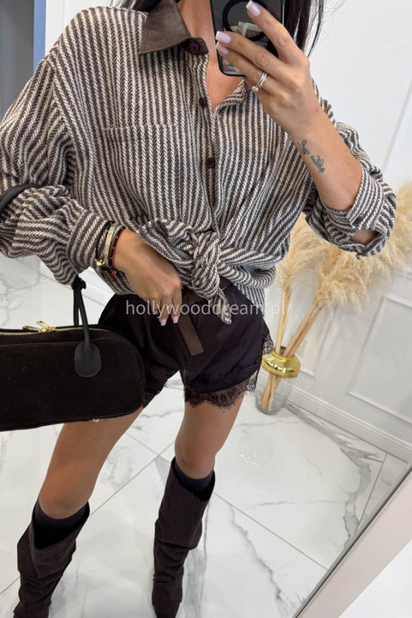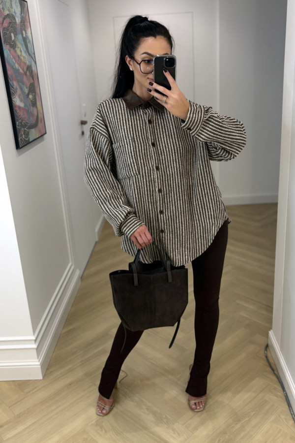 - Czekoladowo-kremowa koszula w jodełkę ze skórzanym kołnierzem AMBER