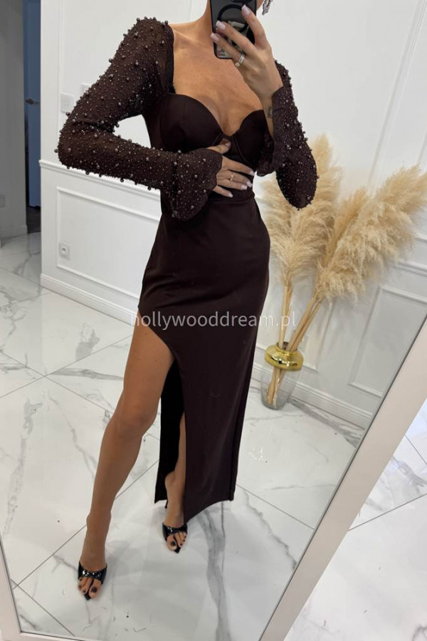 - czekoladowa sukienka z dużym rozcięciem po boku