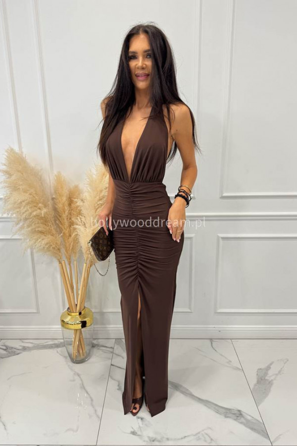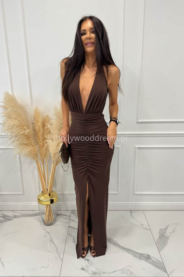 - Brązowa sukienka maxi z marszczeniami i wiązaniem na biust LORA