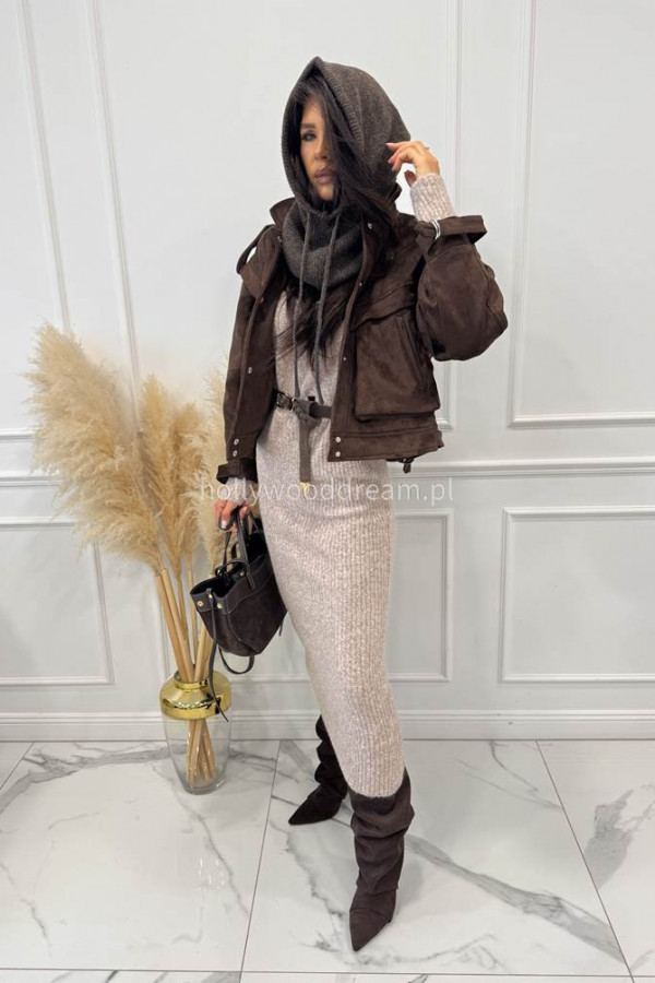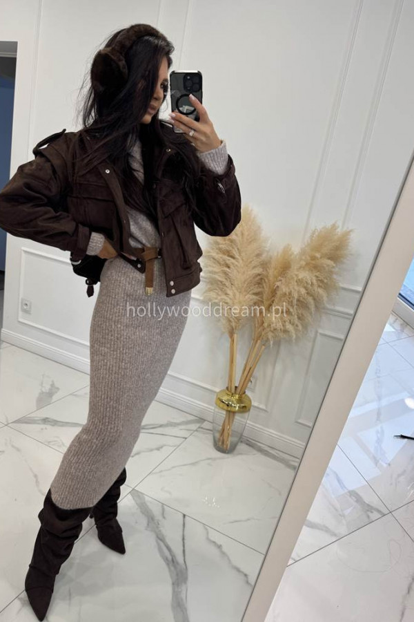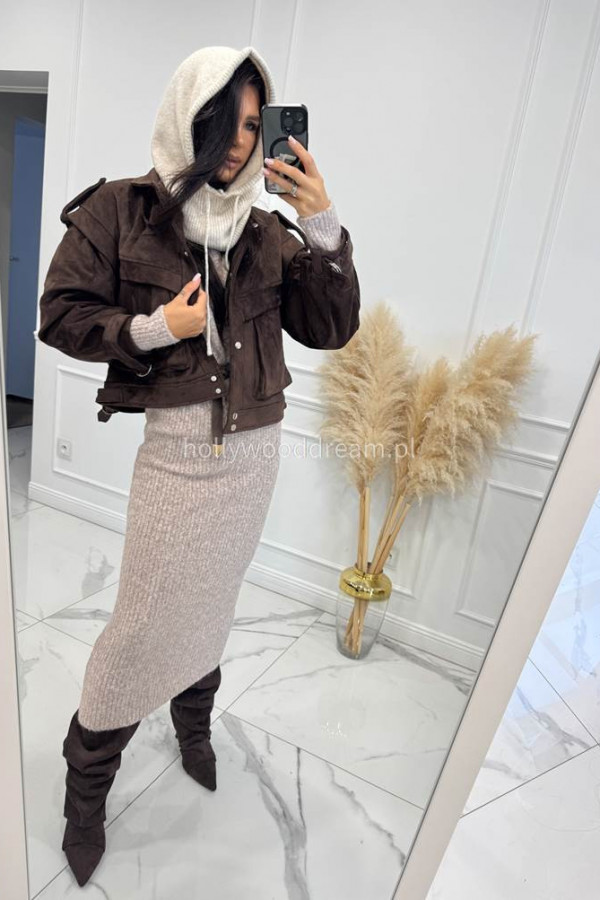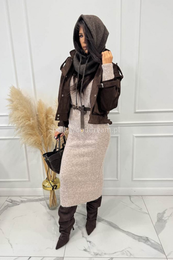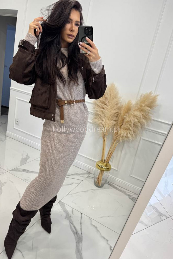 - Beżowa sukienka midi sweterkowa z szerszą górą na długi rękaw ŻANETKA