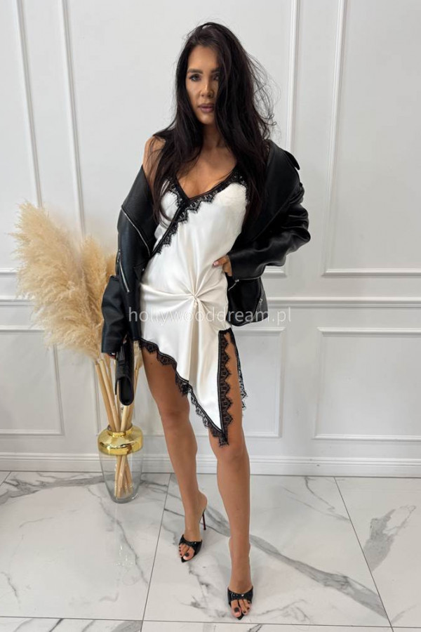 - Kremowa sukienka satynowa z jednym dłuższym bokiem i koronkową lamówką ANGELA