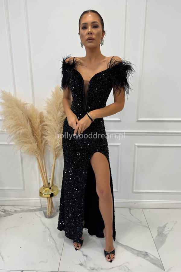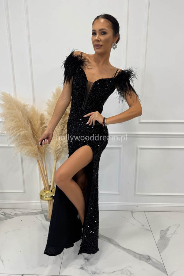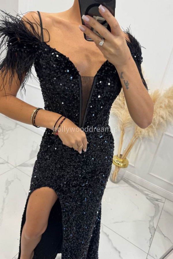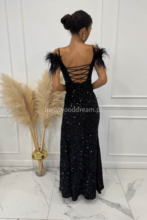- Czarna sukienka maxi z cekinami, wiązaniem na plecach i piórami przy ramionach SYRENA