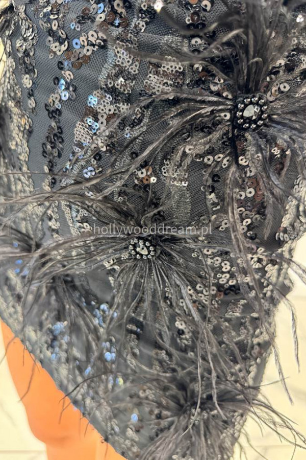 Czarna sukienka dopasowana na ramiączkach z cekinami i piórami DIAMOND 01