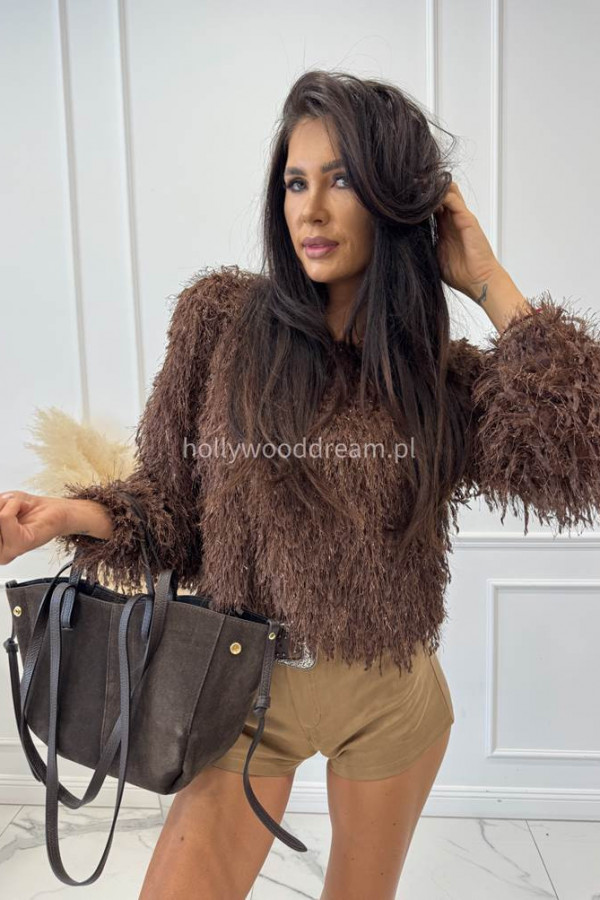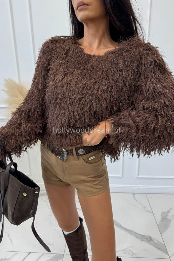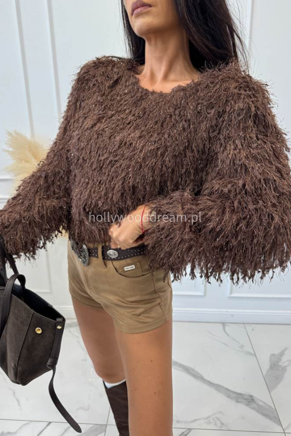 Brązowa bluzka na długi rękaw z długim włosem i srebrną nitką KORAL 01