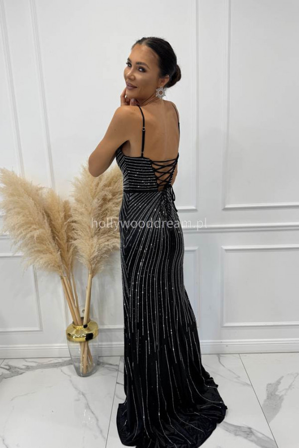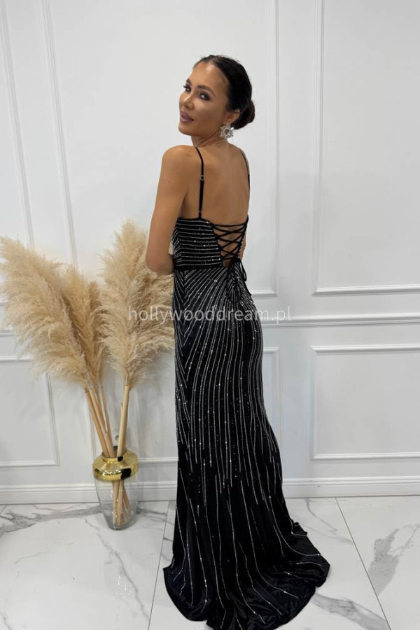 - Czarna sukienka maxi na ramiączkach z cyrkoniami i wiązanymi plecami LUXURY