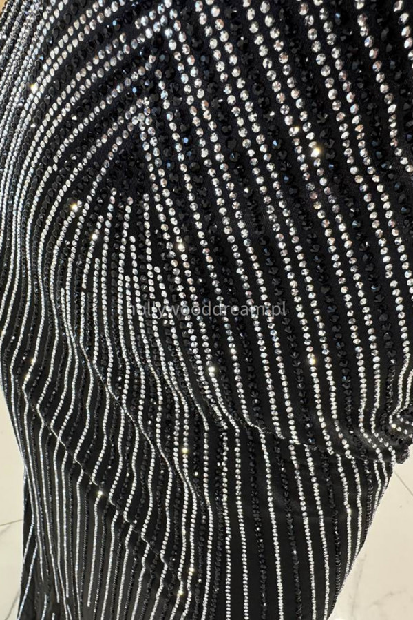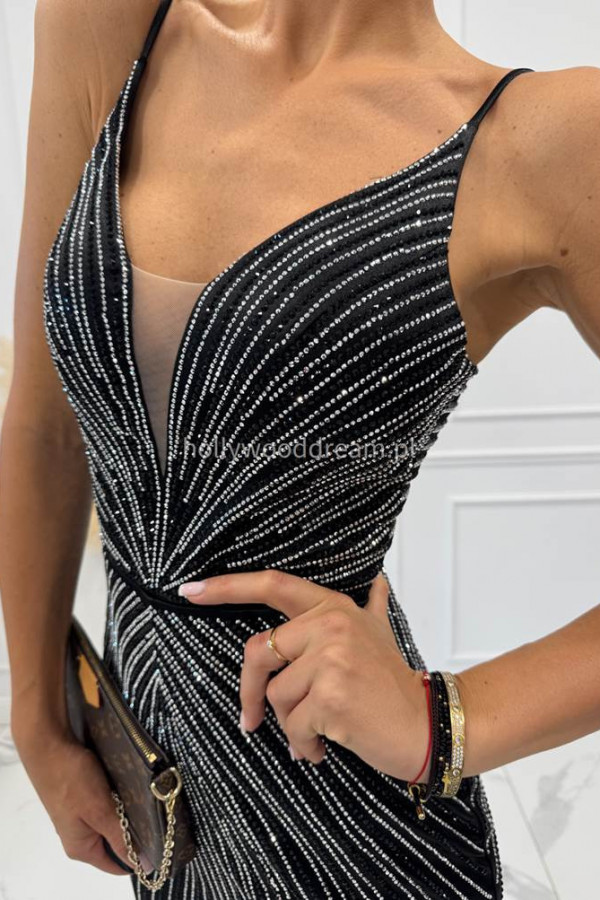 Czarna sukienka maxi na ramiączkach z cyrkoniami i wiązanymi plecami LUXURY 01