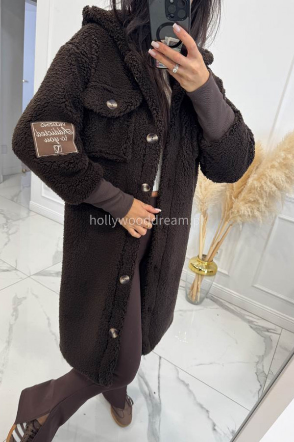 Czekoladowy płaszcz KENZO 129 to elegancki pluszowy kożuch o długości midi, idealny na chłodniejsze dni. Wykonany przez polskiego producenta, zapewnia wysoką jakość i trwałość. Zapinany na guziki i wyposażony w kaptur, łączy wygodę z modnym designem, pasując zarówno do casualowych, jak i bardziej eleganckich stylizacji.