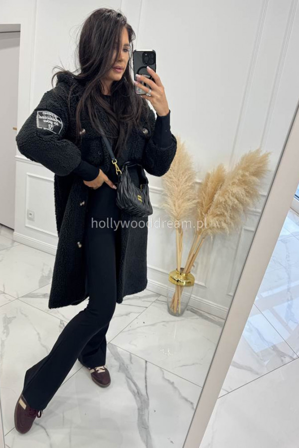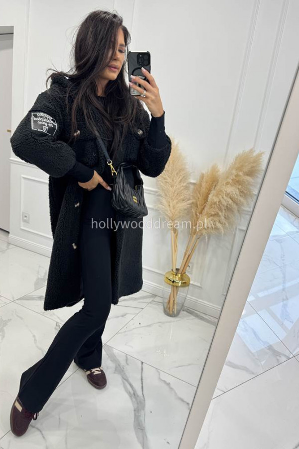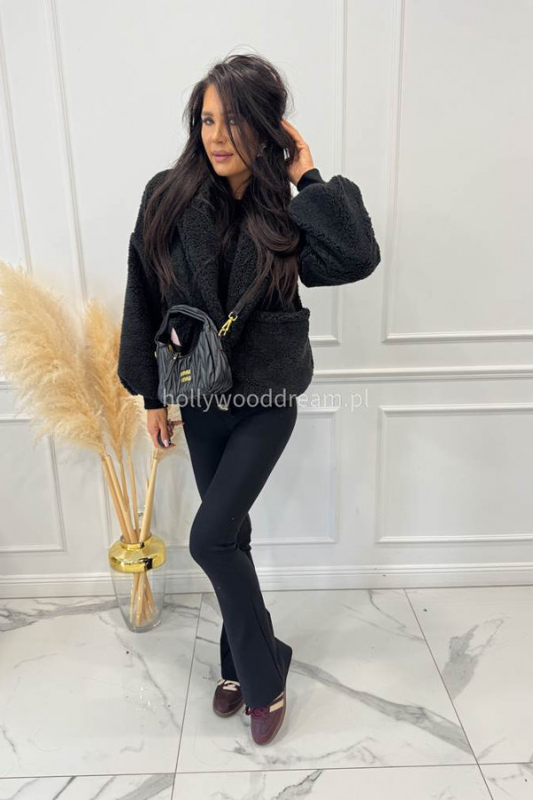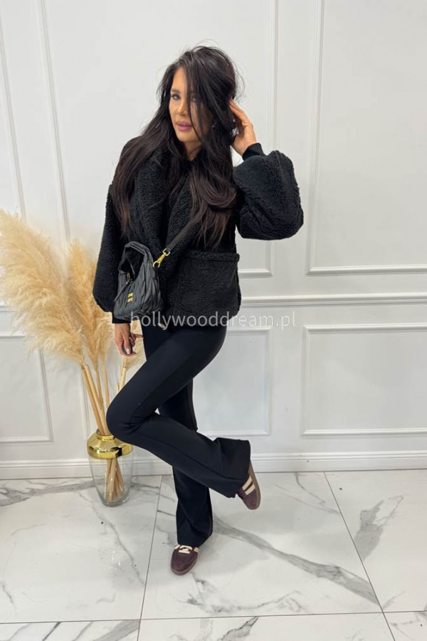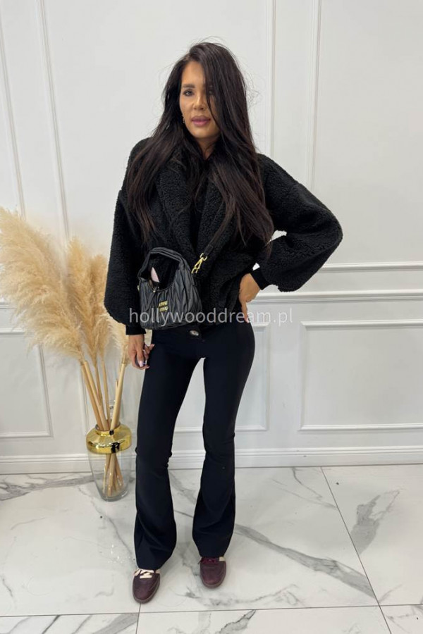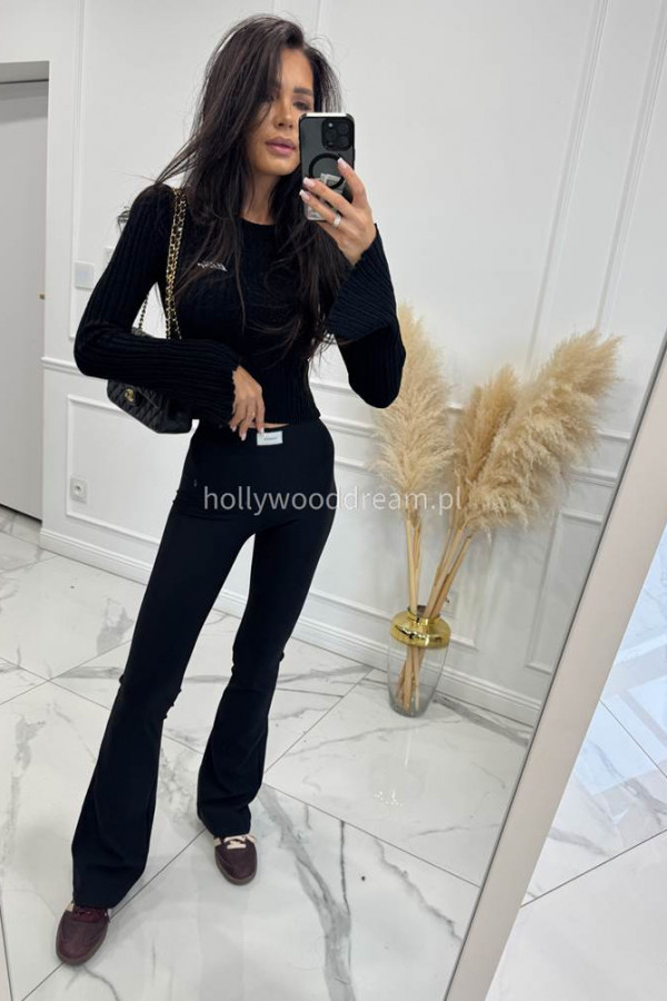 Czarne legginsy dzwony prążkowane Majkel 34 wykonane z elastycznego, lekko połyskującego materiału pięknie modelują sylwetkę i podkreślają kobiece kształty. Dzięki wysokiej jakości tkaninie zapewniają wygodę i komfort noszenia przez cały dzień. Idealne zarówno do sportowych stylizacji, jak i eleganckich zestawów casualowych.