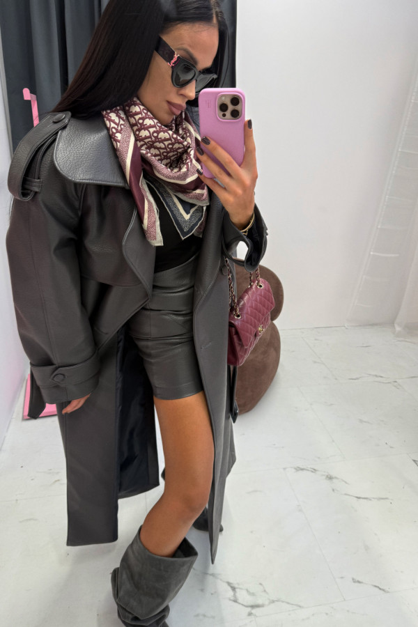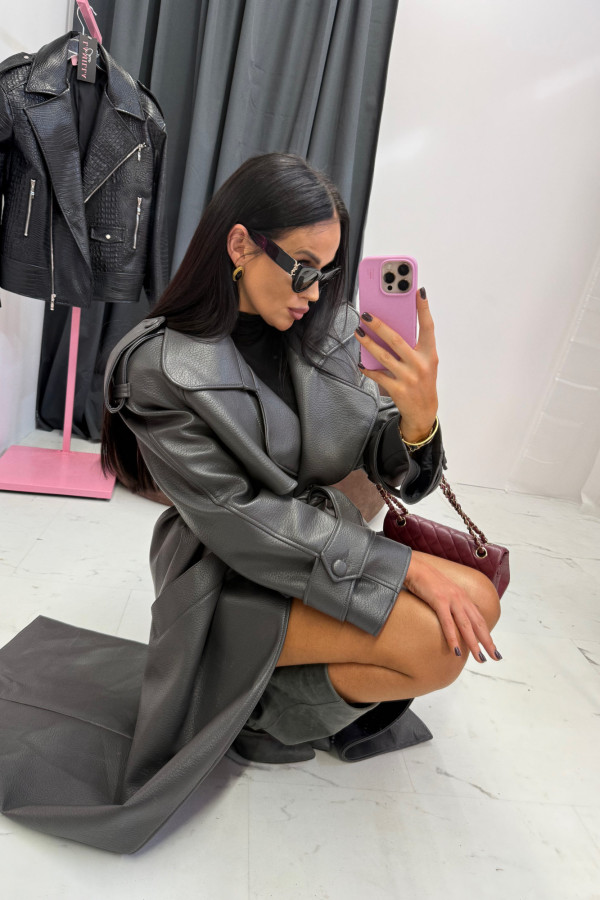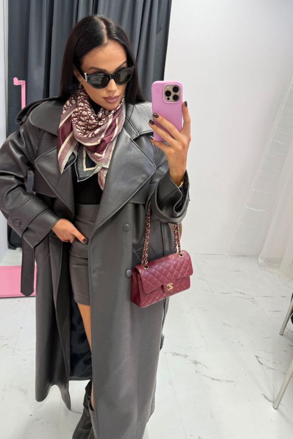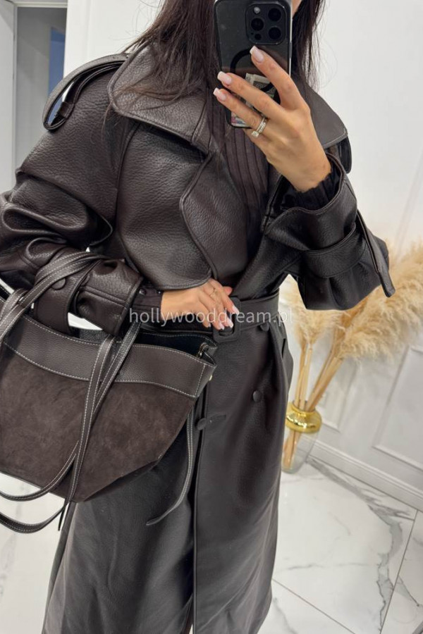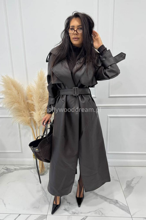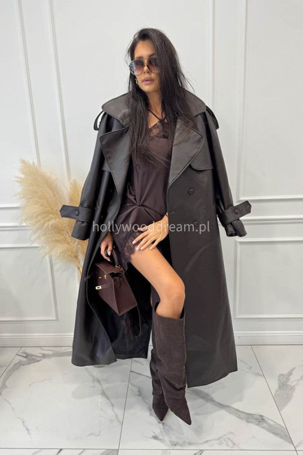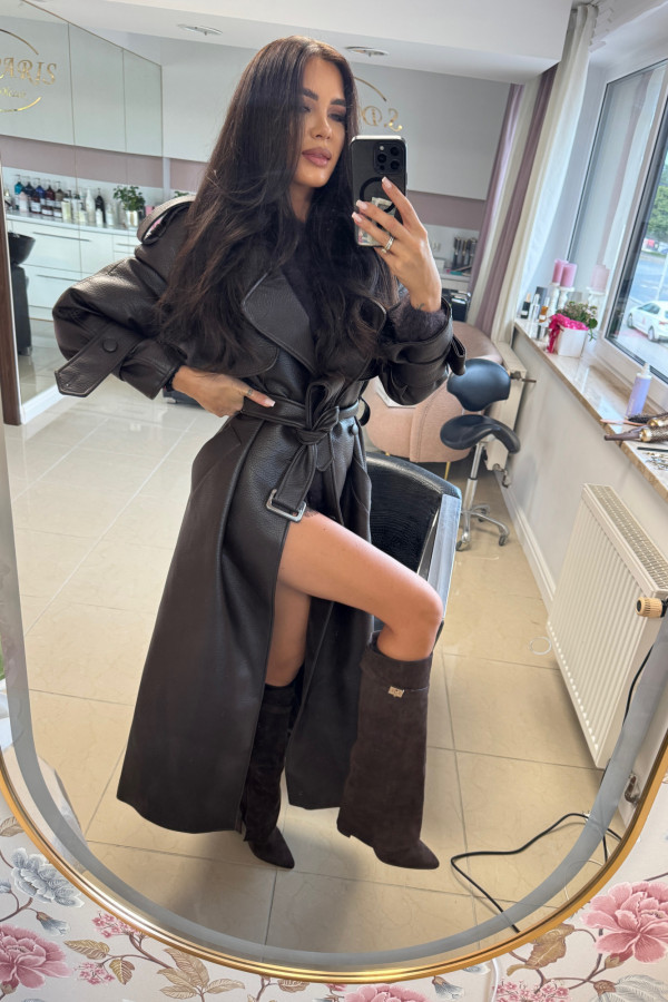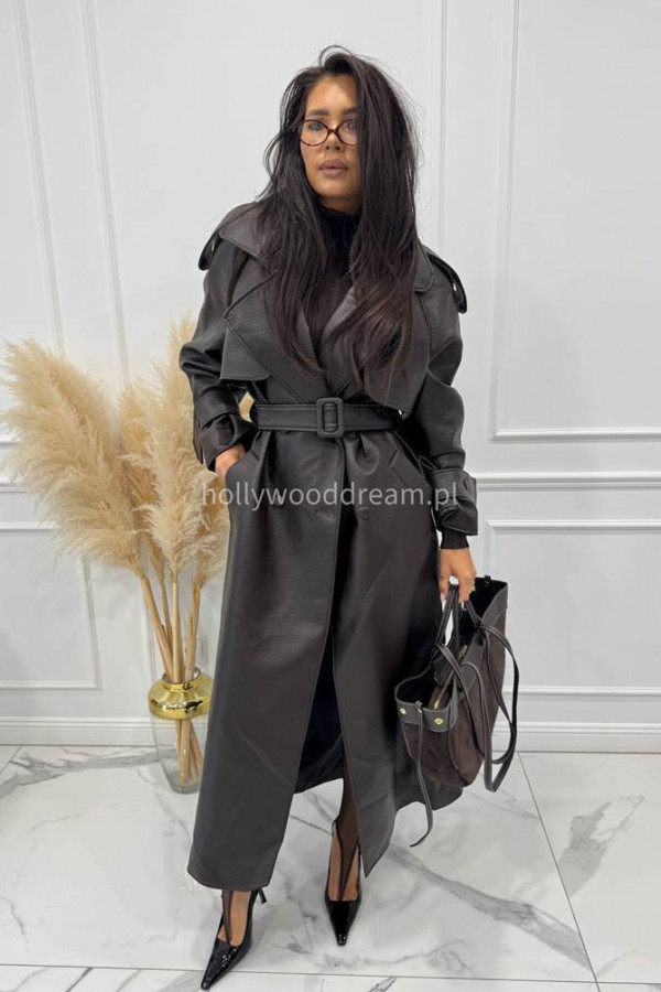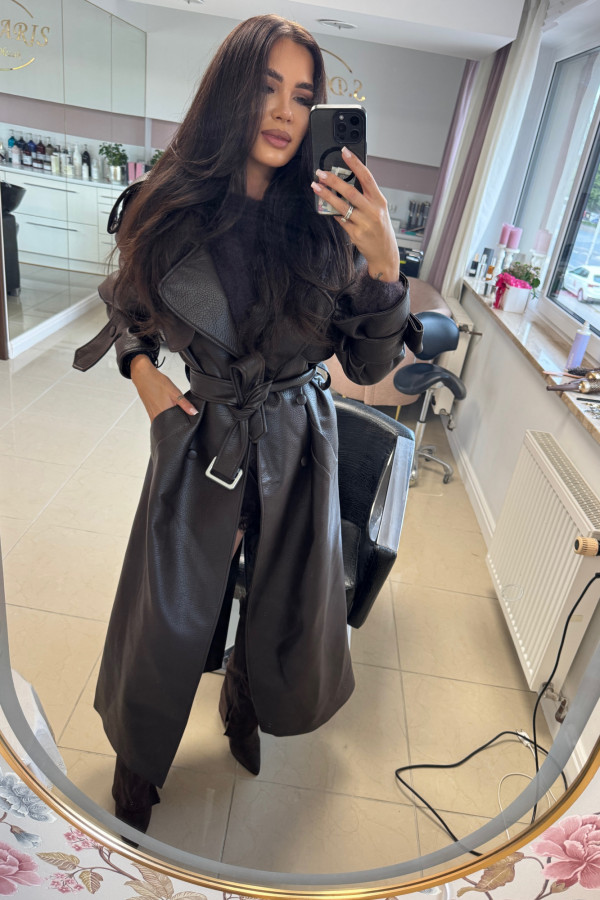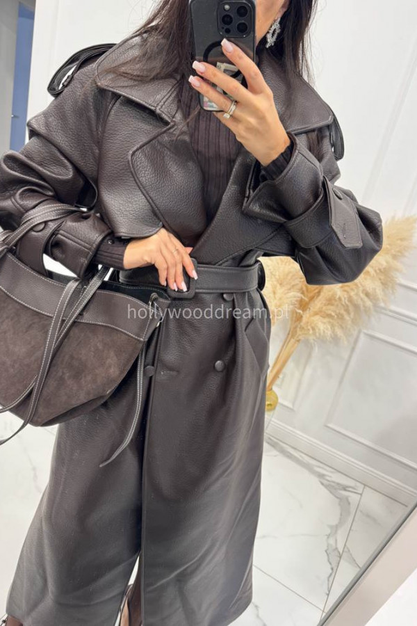 - Czekoladowy płaszcz długi skórzany z paskiem OLEK