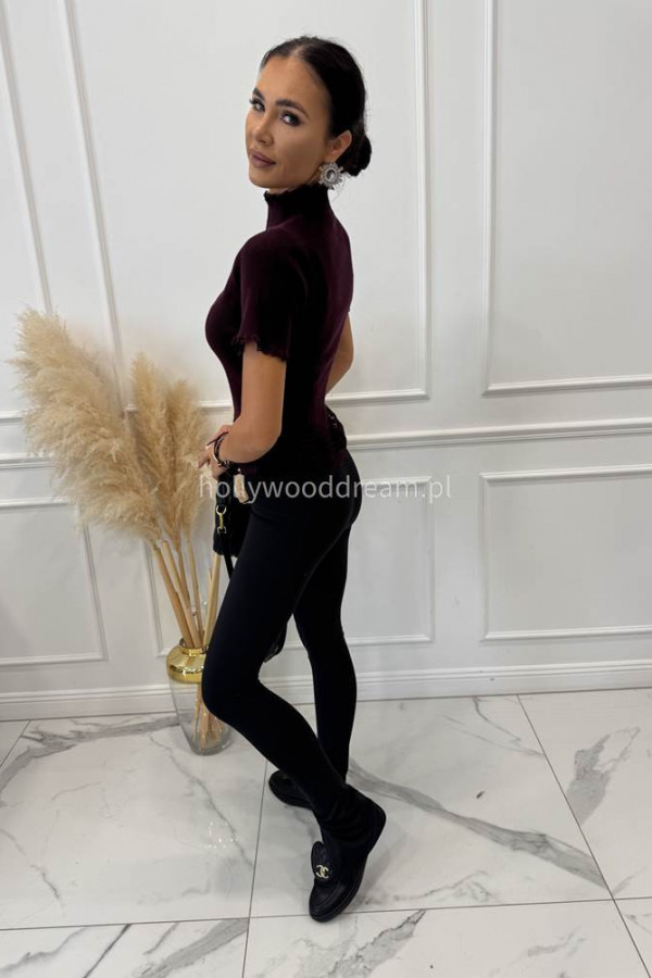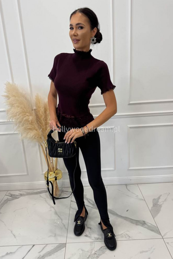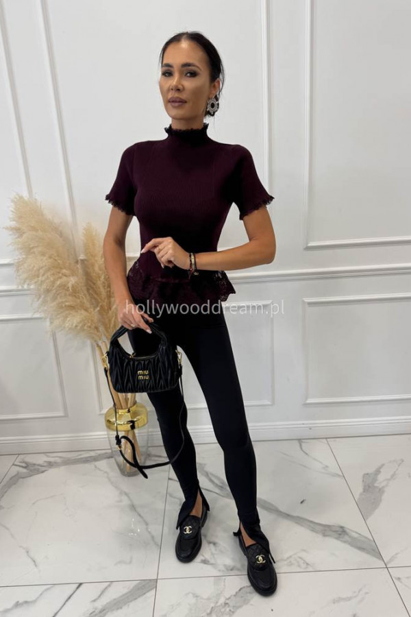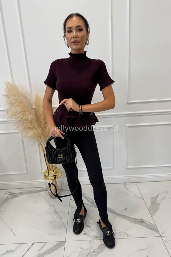- Bordowa bluzka prążkowana na krótki rękaw z koronką ELŻBIETA