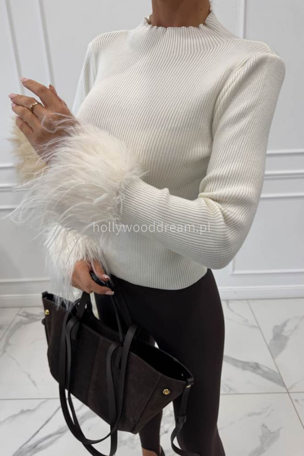 - Kremowa bluzka prążkowana z półgolfem i futerkiem przy rękawie SOHO