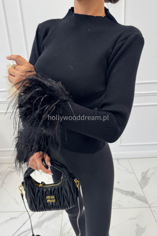 Czarna bluzka prążkowana z półgolfem i futerkiem przy rękawie SOHO 09