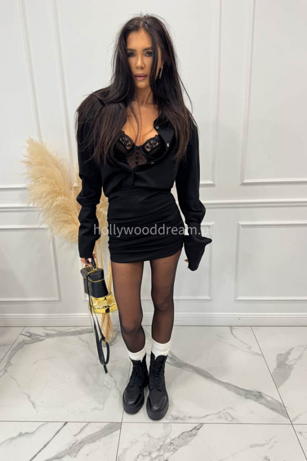 Czarny komplet koszula z wysokim mankietem+spódniczka drapowana mini FOLLY 161