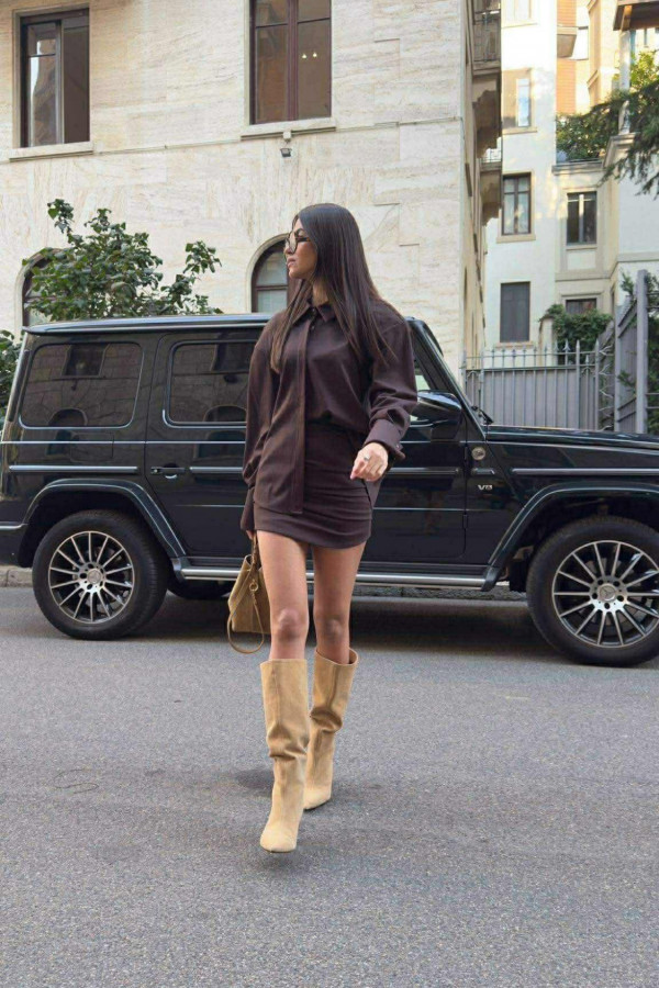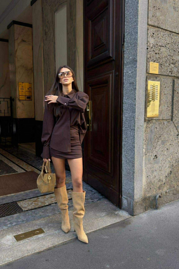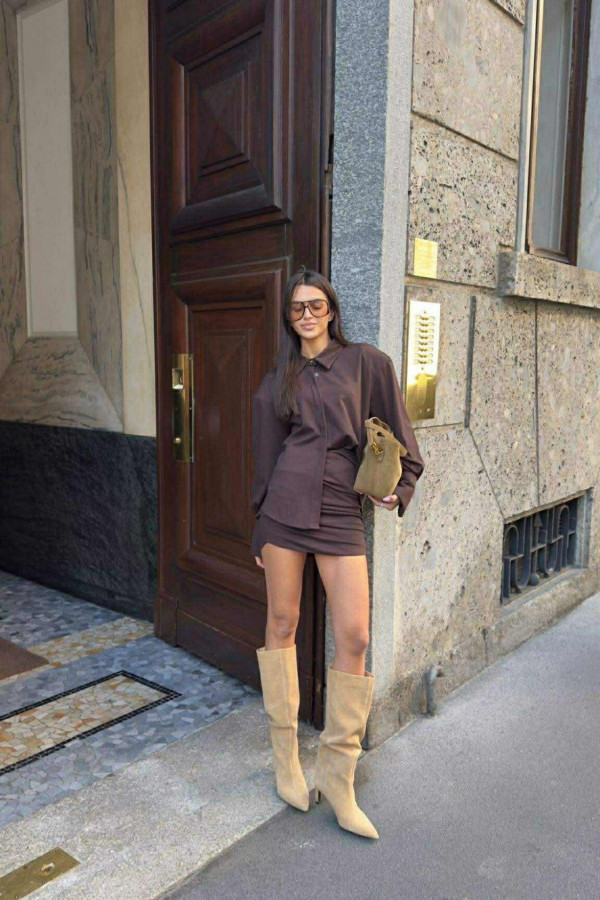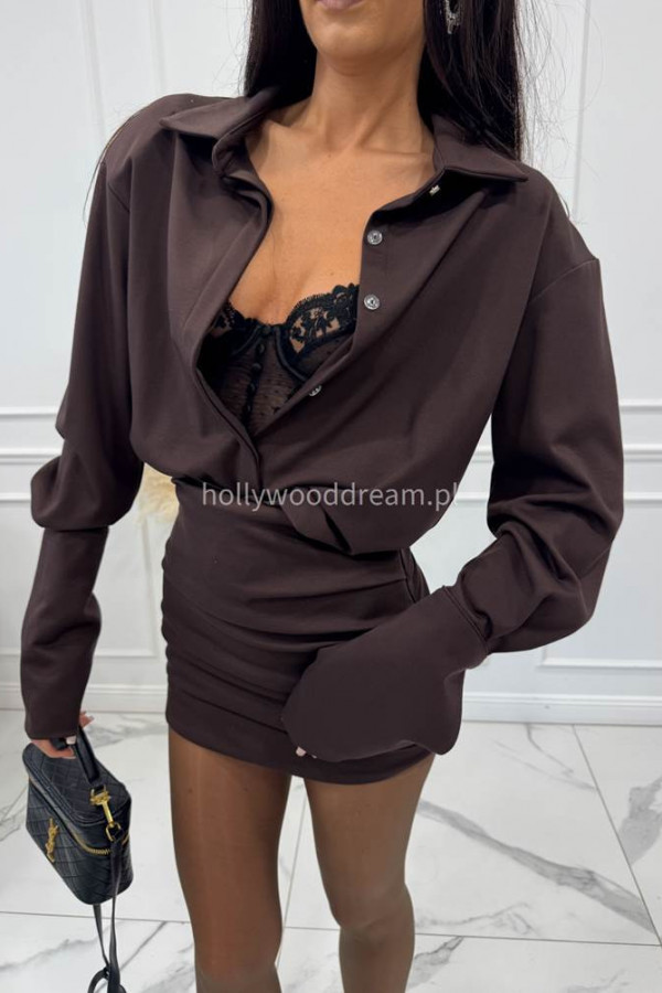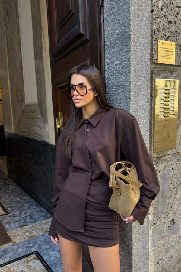 Czekoladowy komplet koszula z wysokim mankietem+spódniczka drapowana mini FOLLY 161