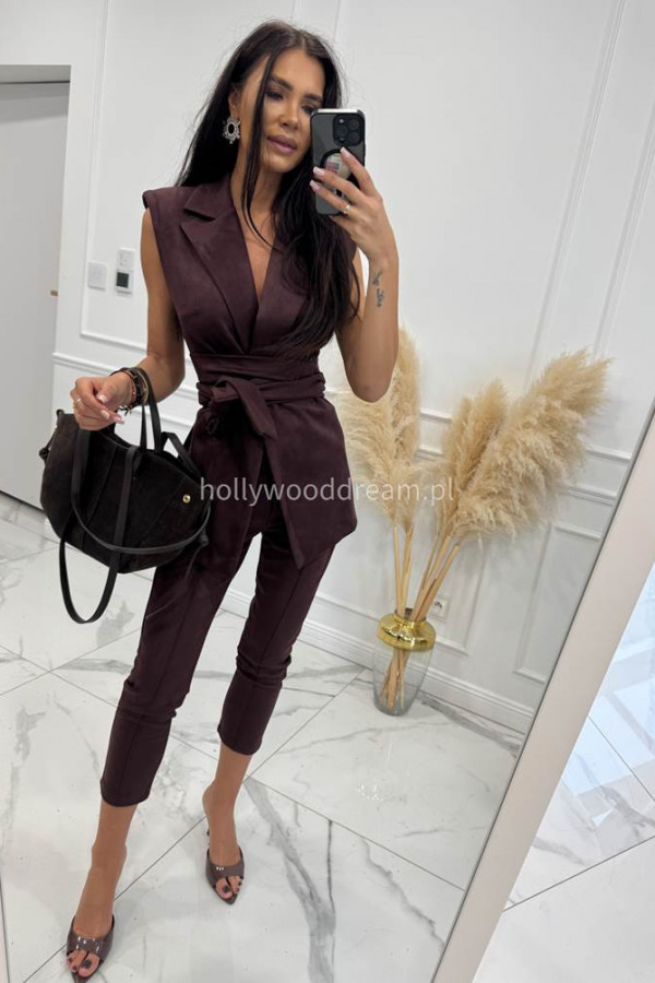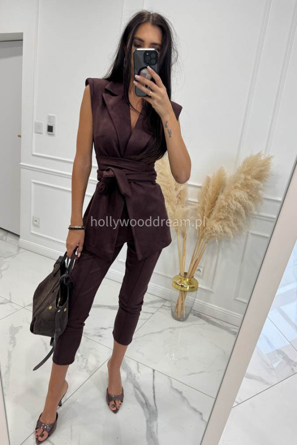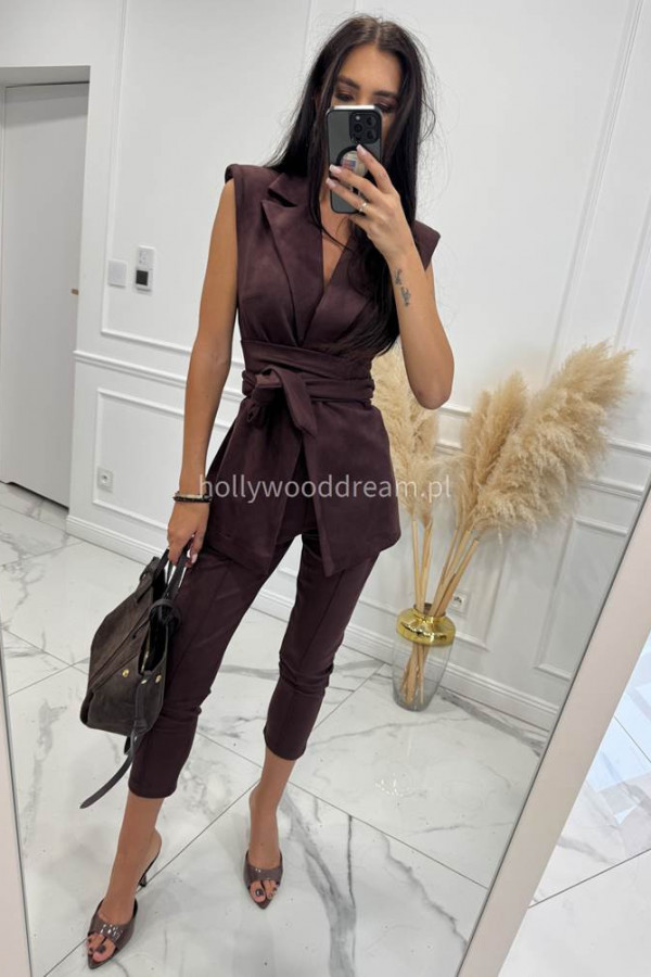 - Czekoladowa kamizelka dłuższa zamszowa z paskiem ELEONORA