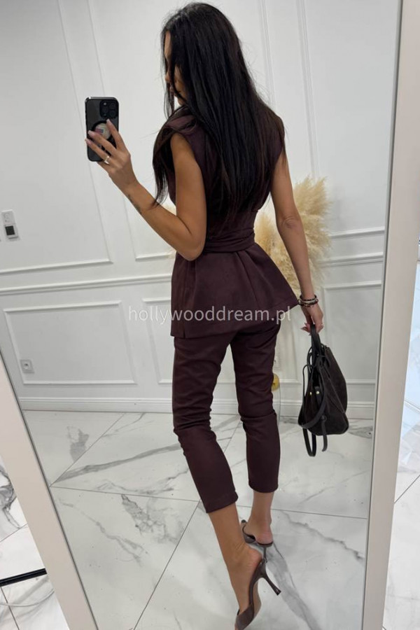 Czekoladowa kamizelka dłuższa zamszowa z paskiem ELEONORA 121