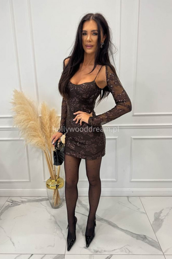 - Czekoladowa sukienka mini z cekinami i bolerkiem SHEILA