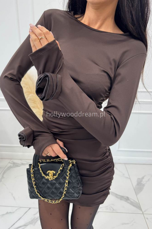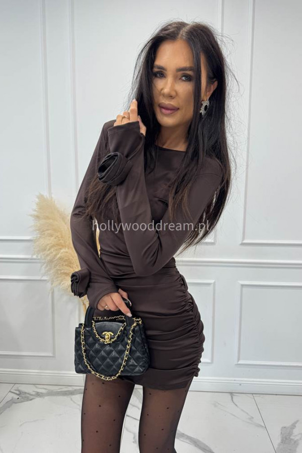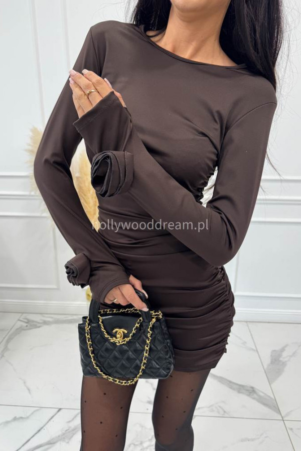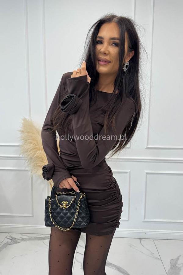 - czekoladowa sukienka drapowana z aplikacjami róż