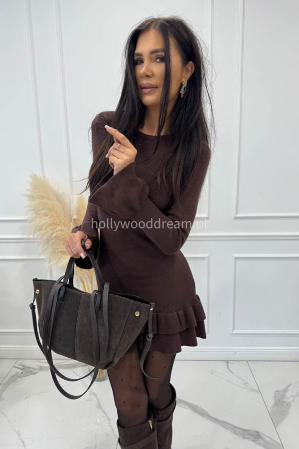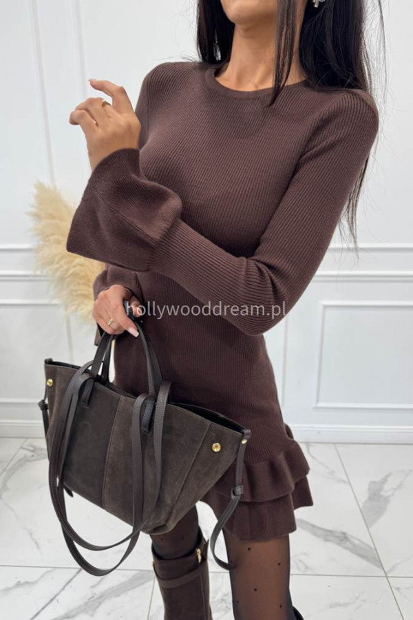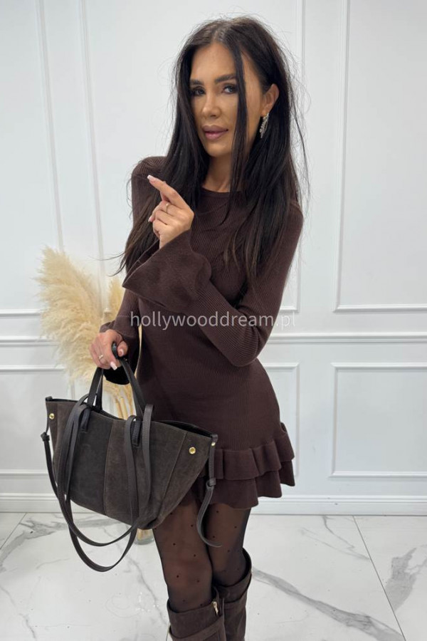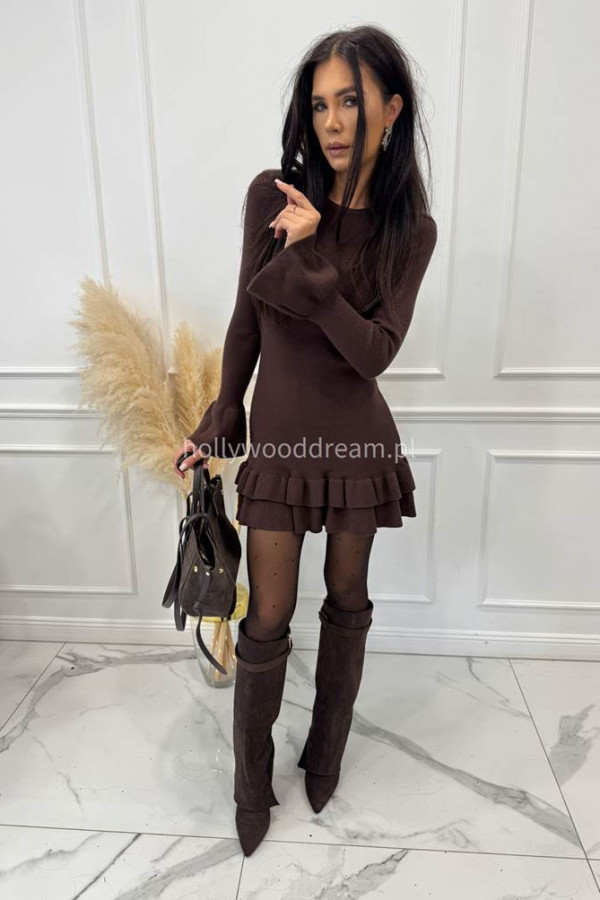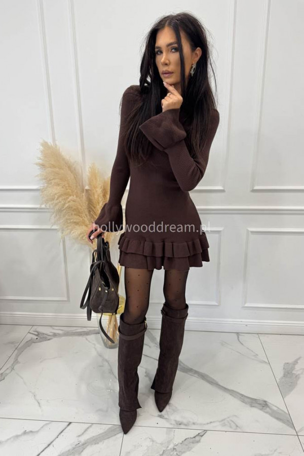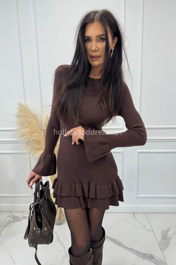 Brązowa sukienka prążkowana mini na długi rękaw z falbana na dole PAMELA 09