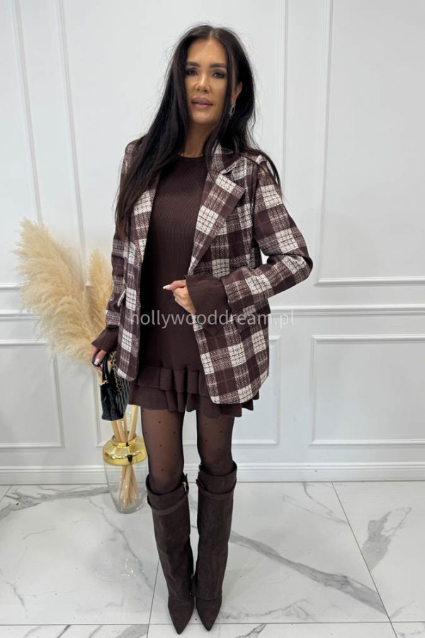 - Brązowa sukienka prążkowana mini na długi rękaw z falbana na dole PAMELA