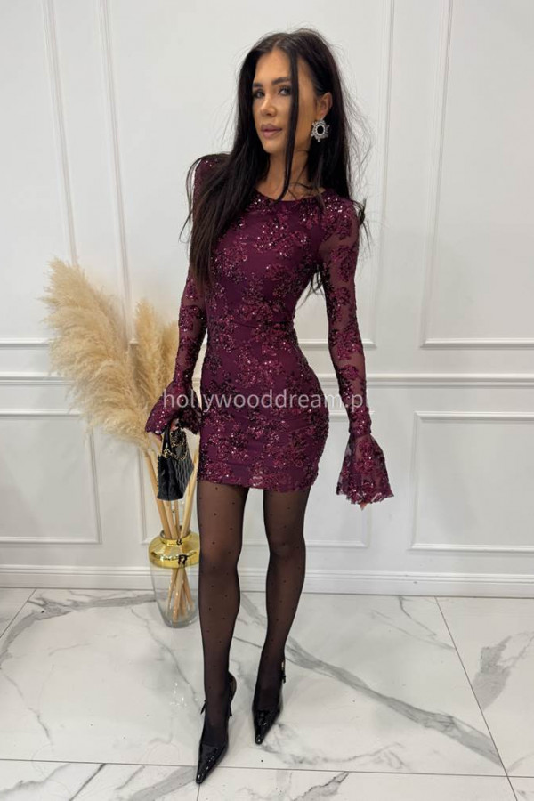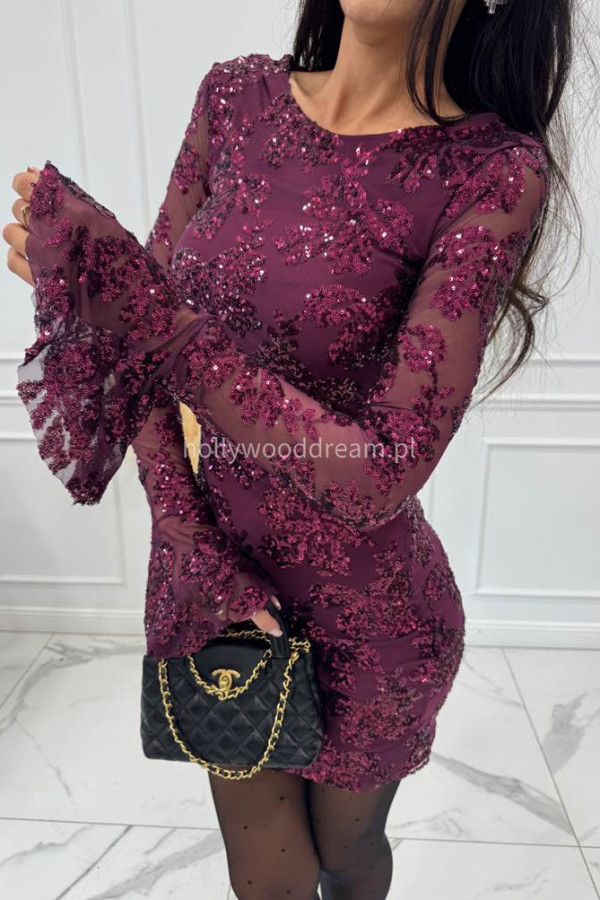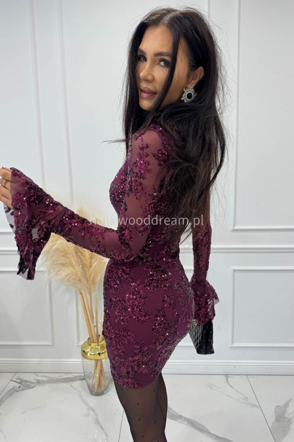 Fioletowa sukienka siateczkowa z cekinami oraz falbaną przy rękawie ARLETA 09