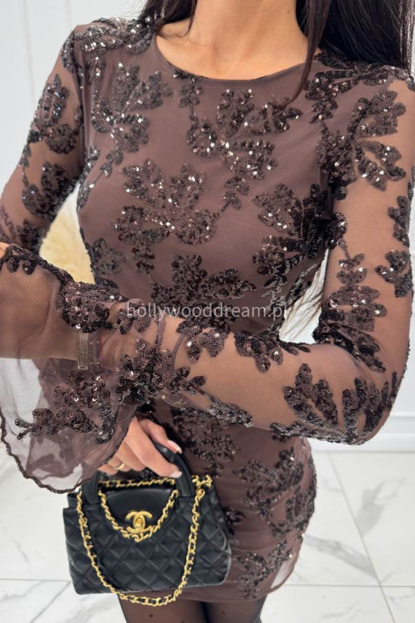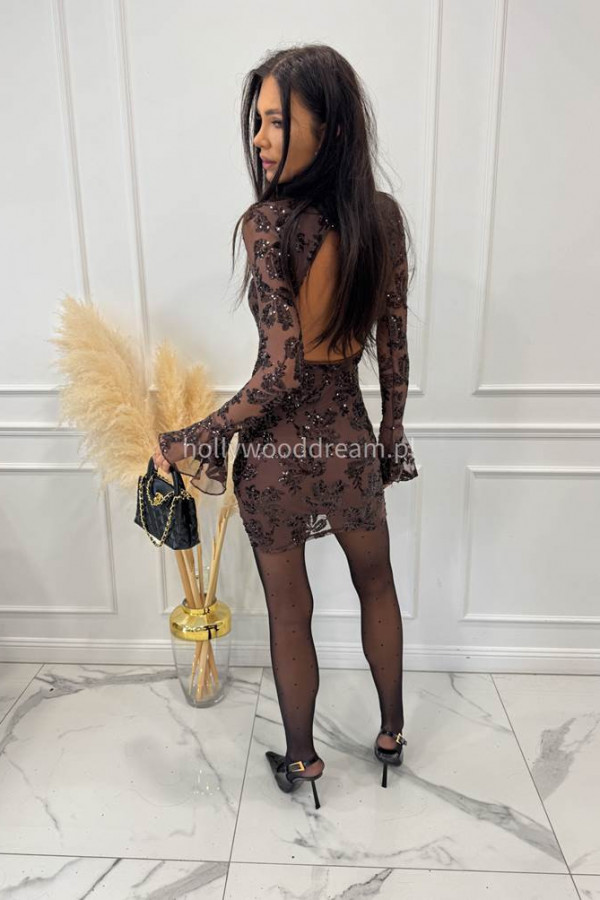 Czekoladowa sukienka cekinowa mini z okrytymi plecami IRMINA 19
