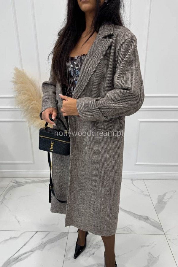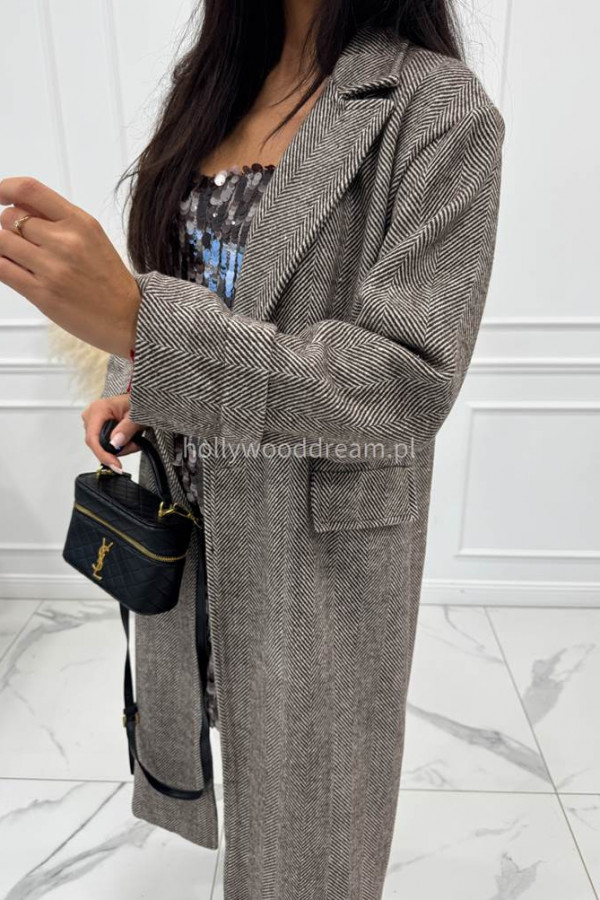 Kremowo brązowy długi płaszcz w jodełkę KORNEL 19