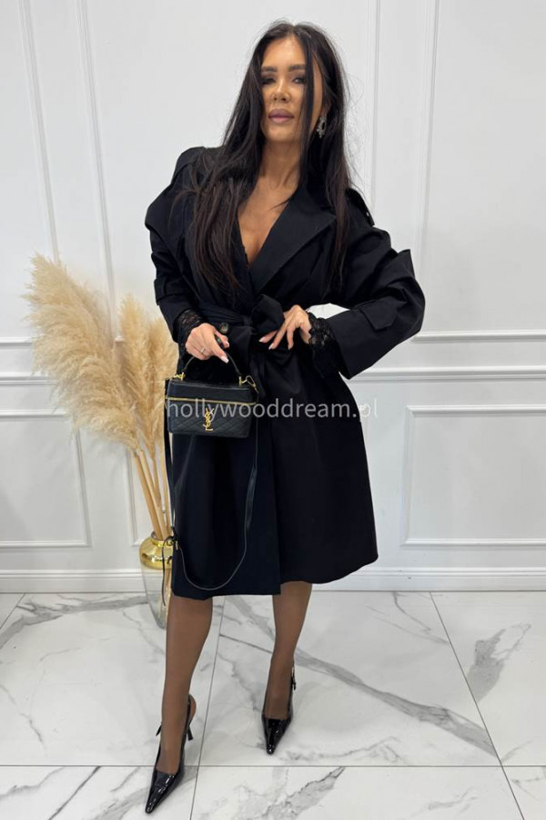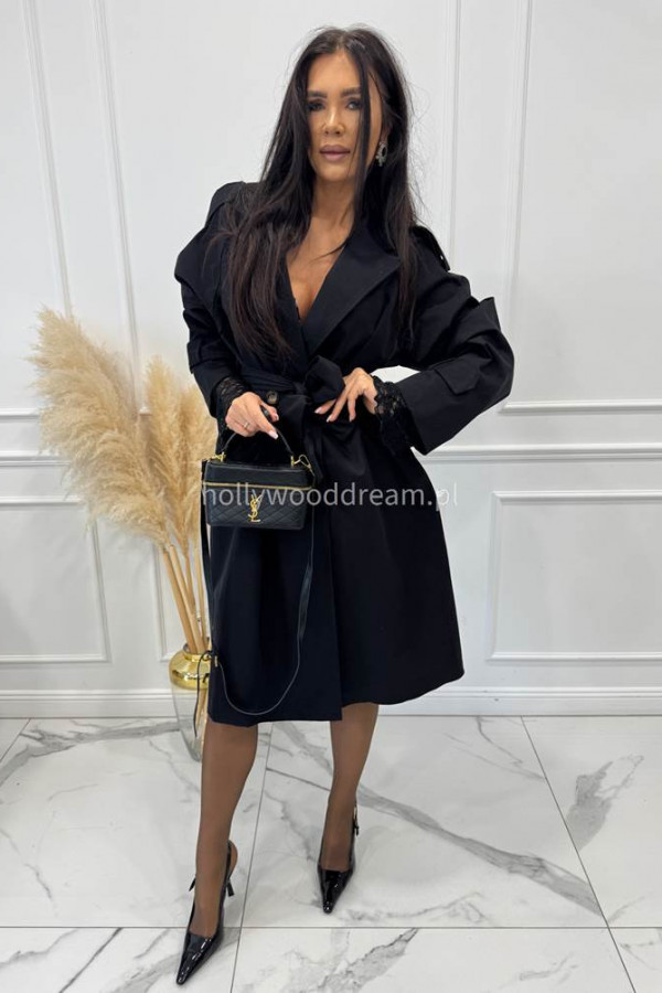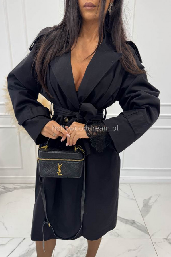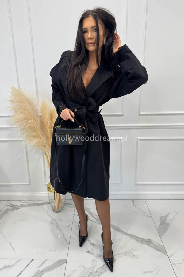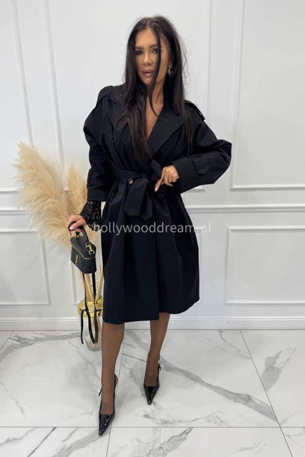 Czarny długi trencz z wiązaniem DAWID to ponadczasowa klasyka z nutą elegancji, idealna na chłodniejsze dni. Sztywny trenczowy materiał nadaje całości luksusowego charakteru, a zapięcie na guziki oraz wiązanie podkreśla sylwetkę i dodaje płaszczowi szyku. Prosty, wydłużony fason wysmukla optycznie figurę i pięknie układa się na każdym typie sylwetki. Płaszcz DAWID sprawdzi się zarówno w stylizacjach codziennych – z jeansami i botkami, jak i w eleganckim wydaniu – z sukienką.