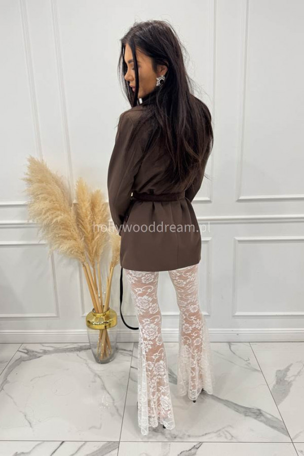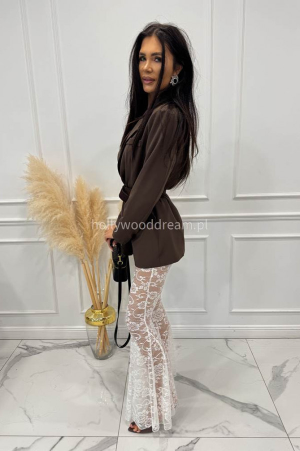 Białe spodnie koronkowe typu dzwony TYMON to odważna i stylowa propozycja dla kobiet, które lubią wyróżniać się modnym designem. Wykonane z efektownej, ażurowej koronki w klasycznej czekoladzie, pięknie podkreślają nogi i dodają stylizacji lekkości. Fason typu dzwony optycznie wydłuża sylwetkę, a jednocześnie nadaje całości retro charakteru w nowoczesnym wydaniu. Idealne na imprezy, wieczorne wyjścia czy festiwalowe stylizacje – sprawią, że każda kreacja nabierze wyjątkowego uroku.
