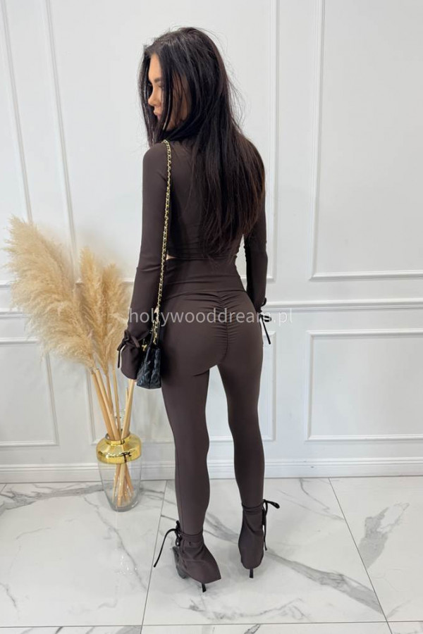 Czekoladowy komplet prążkowany bluzka + legginsy z wiązaniami Milan 173