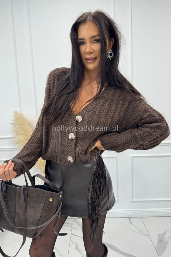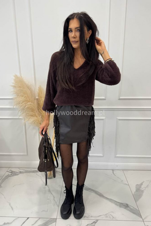 Czekoladowa spódniczka skórzana mini z frędzlami i paskiem OLKA 09