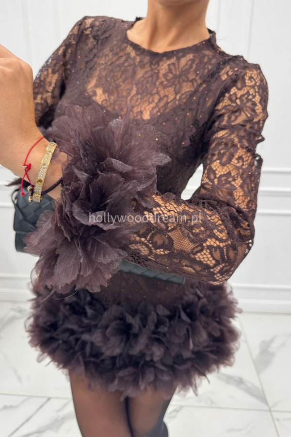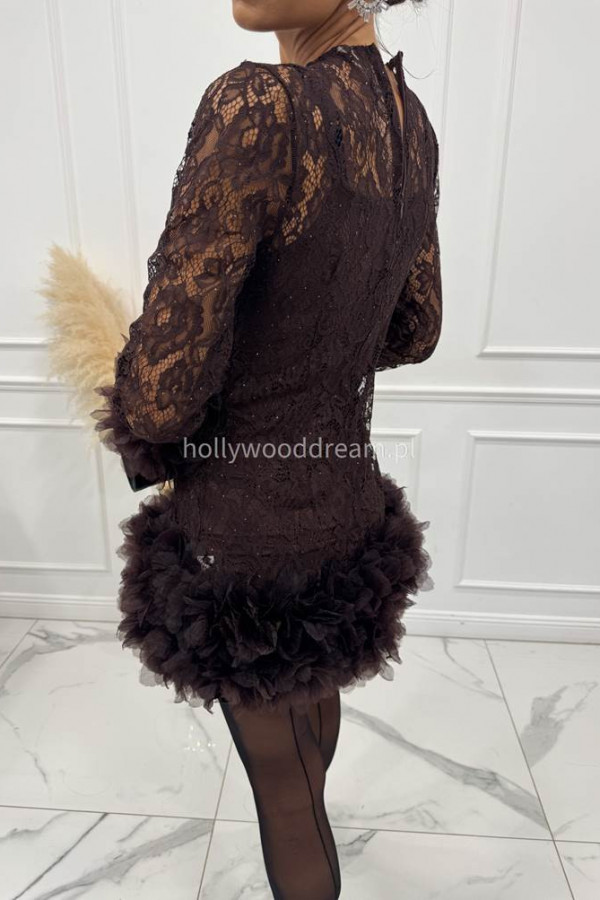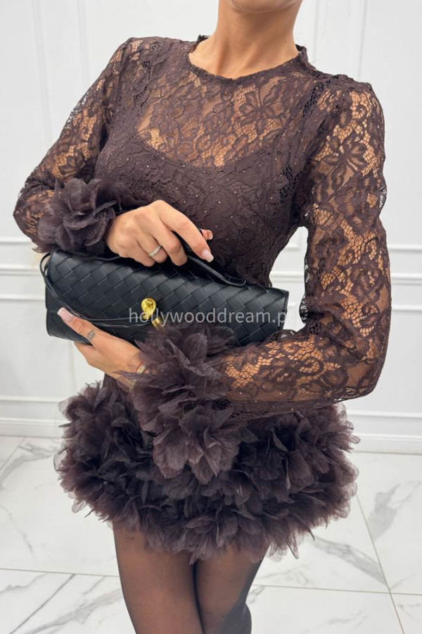 Czekoladowa sukienka koronkowa wykończona tiulem Alesha 09
