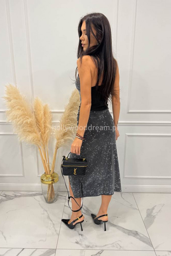 Czarny komplet w srebrne cyrkonie top z różą + spódnica midi z rozporkiem Kinga 09