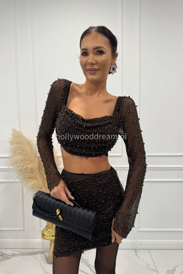 Czekoladowy komplet top + spódnica zdobiony koralikami Aditi 09