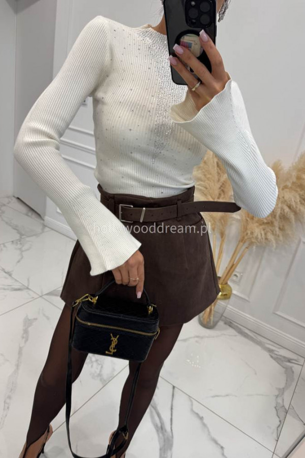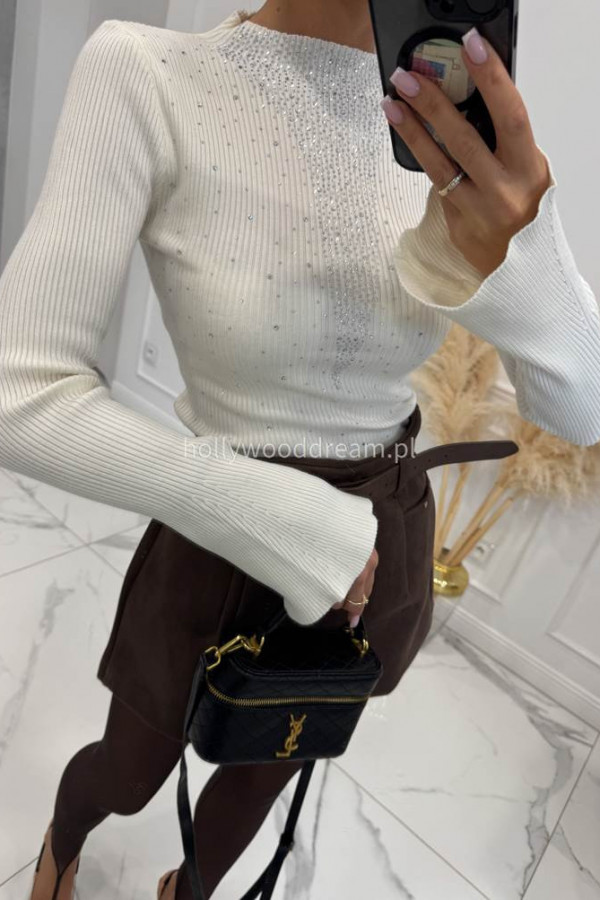 Kremowa bluzka z półgolfem zdobiona cyrkoniami Brylee 09