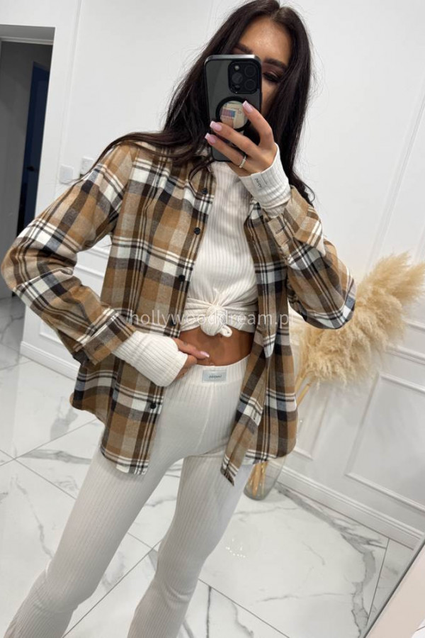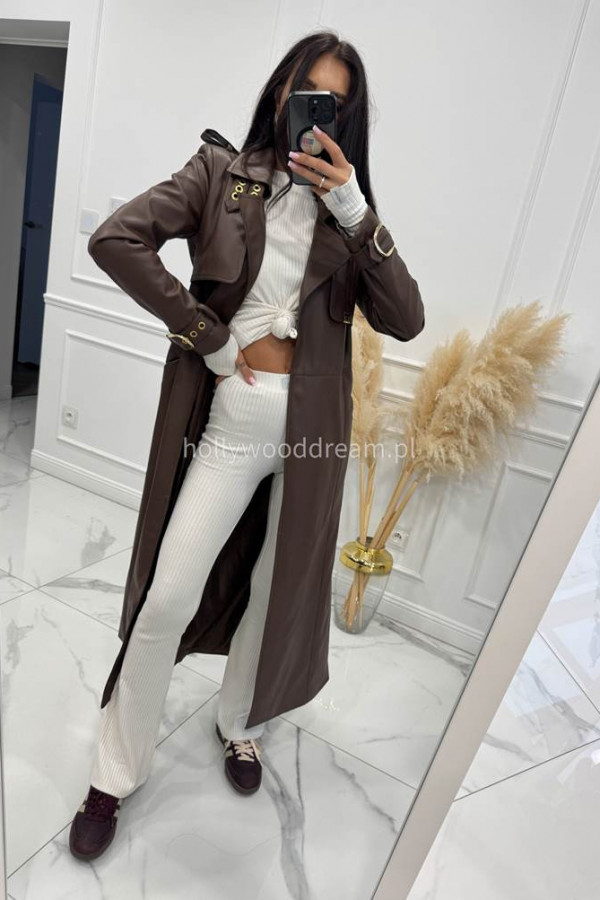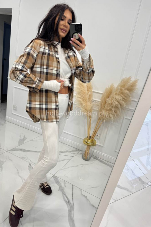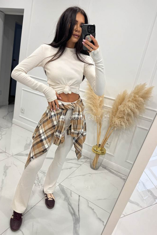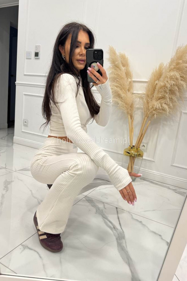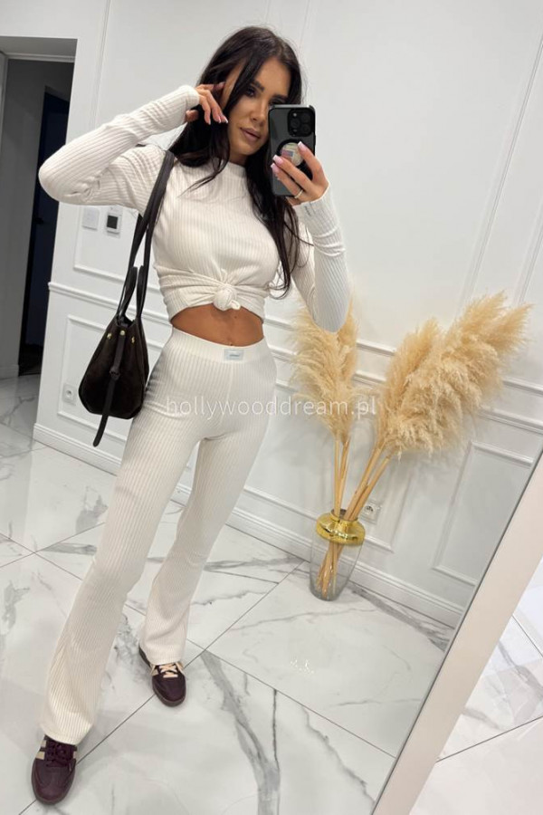 Kremowe prążkowane spodnie dzwony Cierra to modny model łączący wygodę legginsów z efektownym krojem dzwonów. Wykonane z elastycznego materiału, dopasowują się do sylwetki, a prążkowana struktura nadaje im stylowego charakteru. Naszywka w talii dodaje subtelnego detalu, podkreślając nowoczesny design. Idealne do casualowych stylizacji oraz na co dzień.