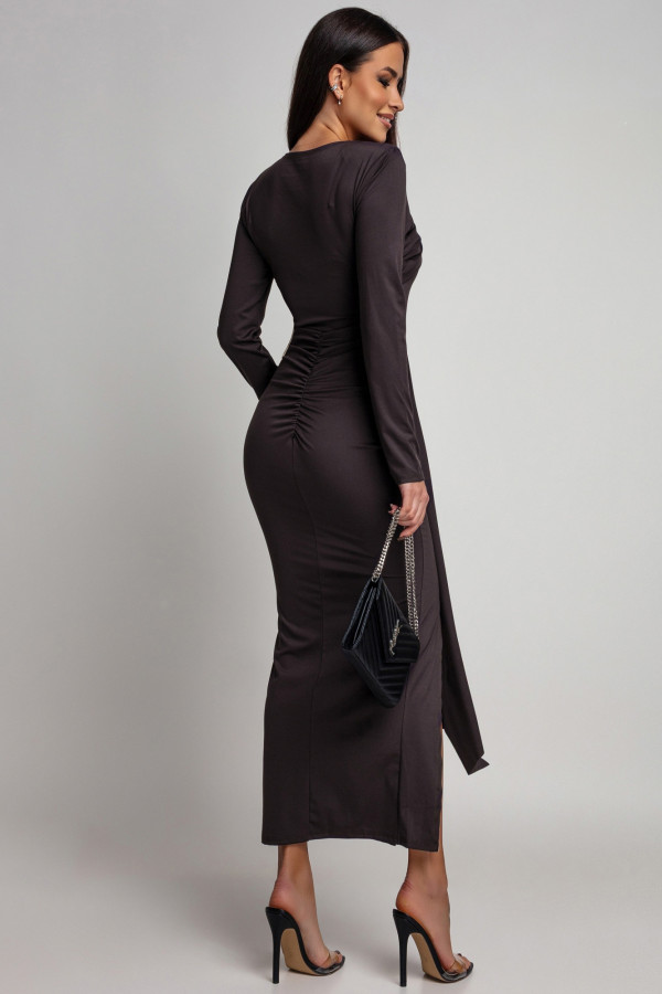 Czekoladowa sukienka maxi z rozporkiem i szarfą oraz ozdobą na dekolcie Lidka 26
