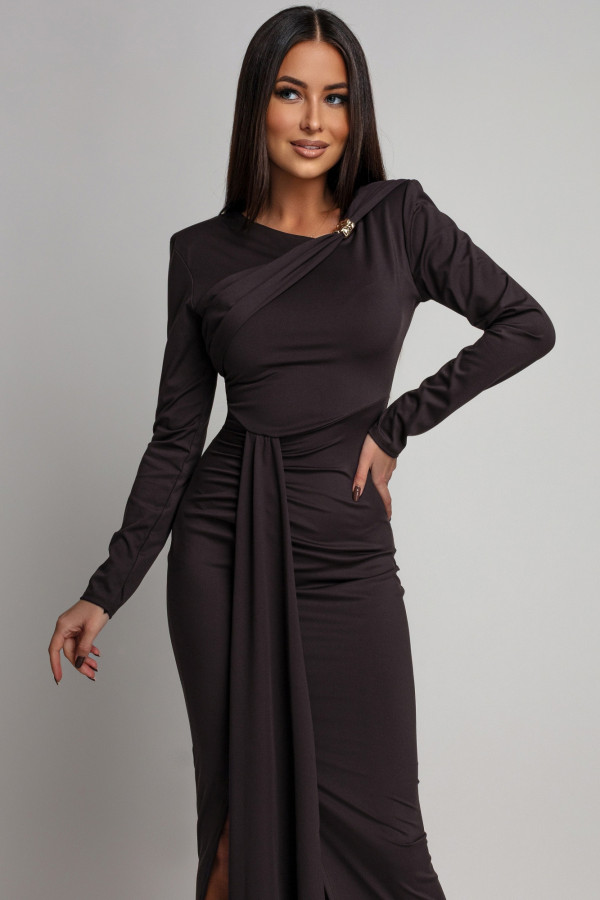 - Czekoladowa sukienka maxi z rozporkiem i szarfą oraz ozdobą na dekolcie Lidka 26