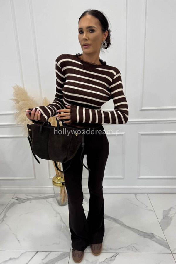 - Brązowa bluzka półgolf w paski wykończona koronką DEBORA