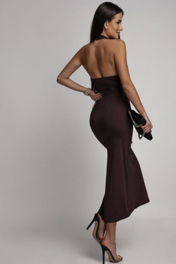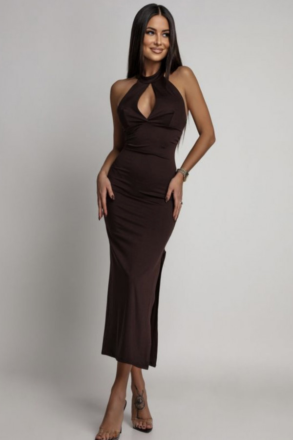 Czekoladowa sukienka z ozdobną różą i wycięciem na dekolcie Erma 26