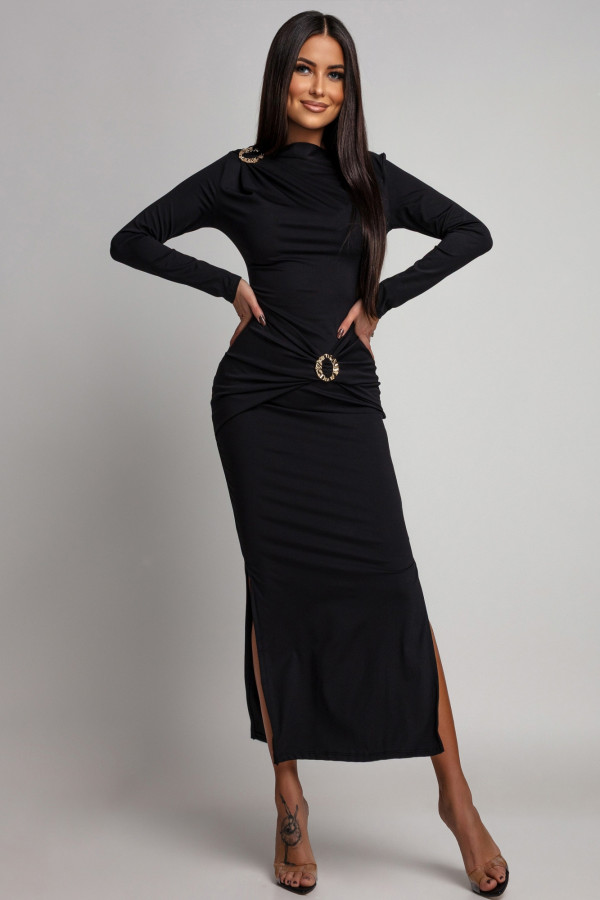 Czarna sukienka maxi z biżuteryjnymi ozdobami SAMMY to wyjątkowa kreacja, która przyciąga wzrok i podkreśla kobiecą sylwetkę w elegancki sposób. Model prezentuje się niezwykle efektownie, a subtelne marszczenie w talii dodaje zmysłowego charakteru. Prawdziwą ozdobą sukienki jest biżuteryjne zdobienie przy szyi oraz w talii, które tworzy niepowtarzalny akcent. Marszczenia na pośladkach podkreślają kształty i dodają stylizacji modowego pazura. Sukienka idealna na wieczorne wyjścia, wyjątkowe okazje i eleganckie przyjęcia.