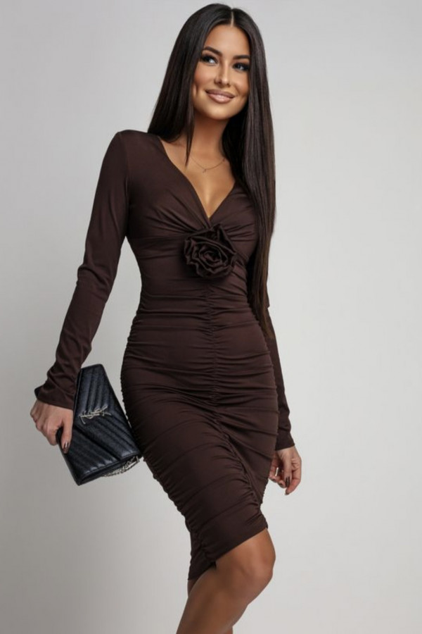 Brązowa sukienka mini z marszczeniem, różą, dekoltem V i długim rękawem EMILY 25