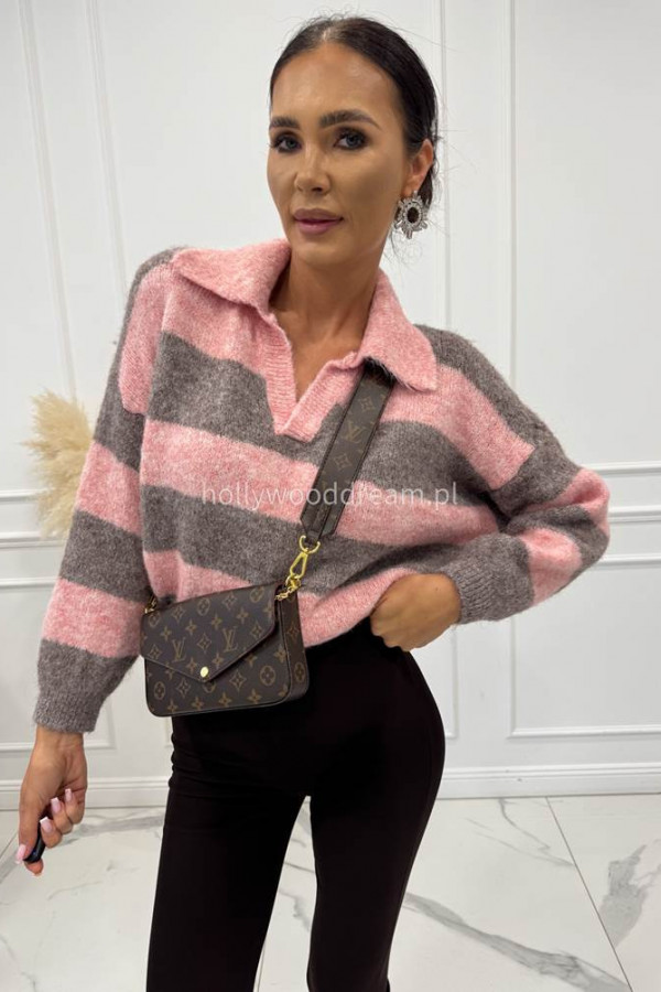 Różowo-szary sweter z kołnierzem w paski ERYK 52