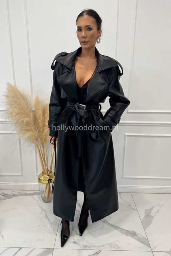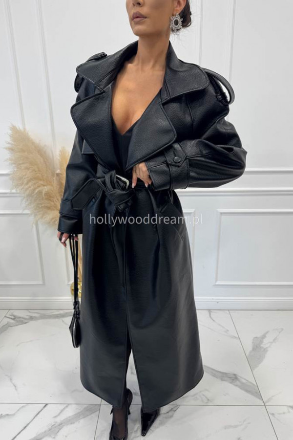 - Czarny płaszcz długi skórzany z paskiem OLEK