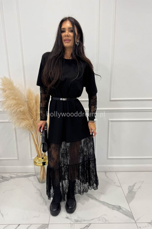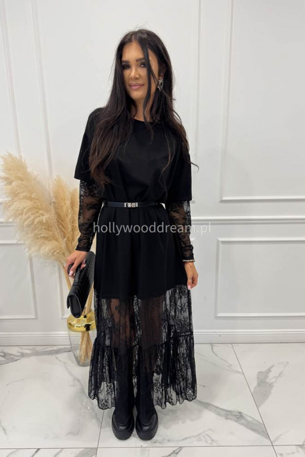 Czarna sukienka maxi oversize z koronkowym dołem i rękawami INGA 17
